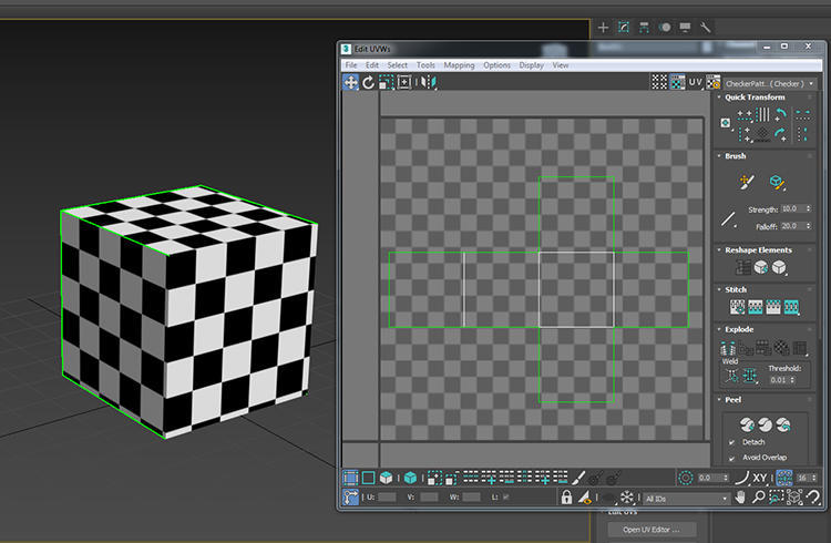 通过应用基本的方格纹理可以很容易看出这一点。如果未拉伸棋盘格图案,则可以避免展开时的变形。但是,这种仅将所有多边形分开的方法的缺点是产生的接缝数量。