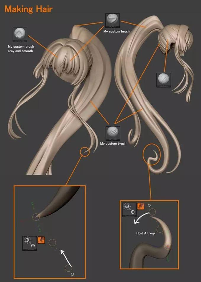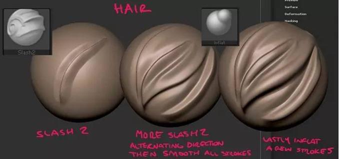 雕刻头发要选对笔刷,这样会事半功倍,也很容易出效果。在雕刻这类头发时多用Slash2这个笔刷。