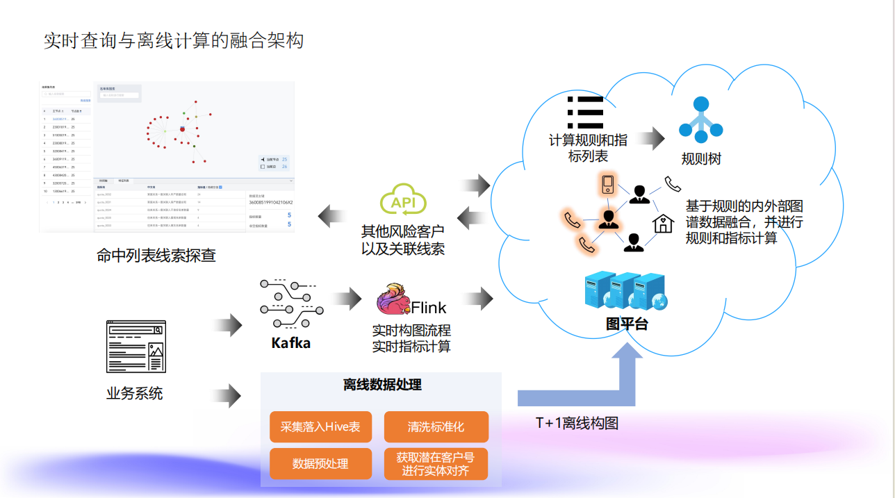 除了实时分析交易行为,还需要对已经落库的数据进行查询,图数据库可以实现实时查询与离线计算的融合。传统数据库中的数据通过 ETL 流程导入图数据库,进而可以执行更复杂的分析计算。例如,在进行社区检测等需要大量计算的任务时,