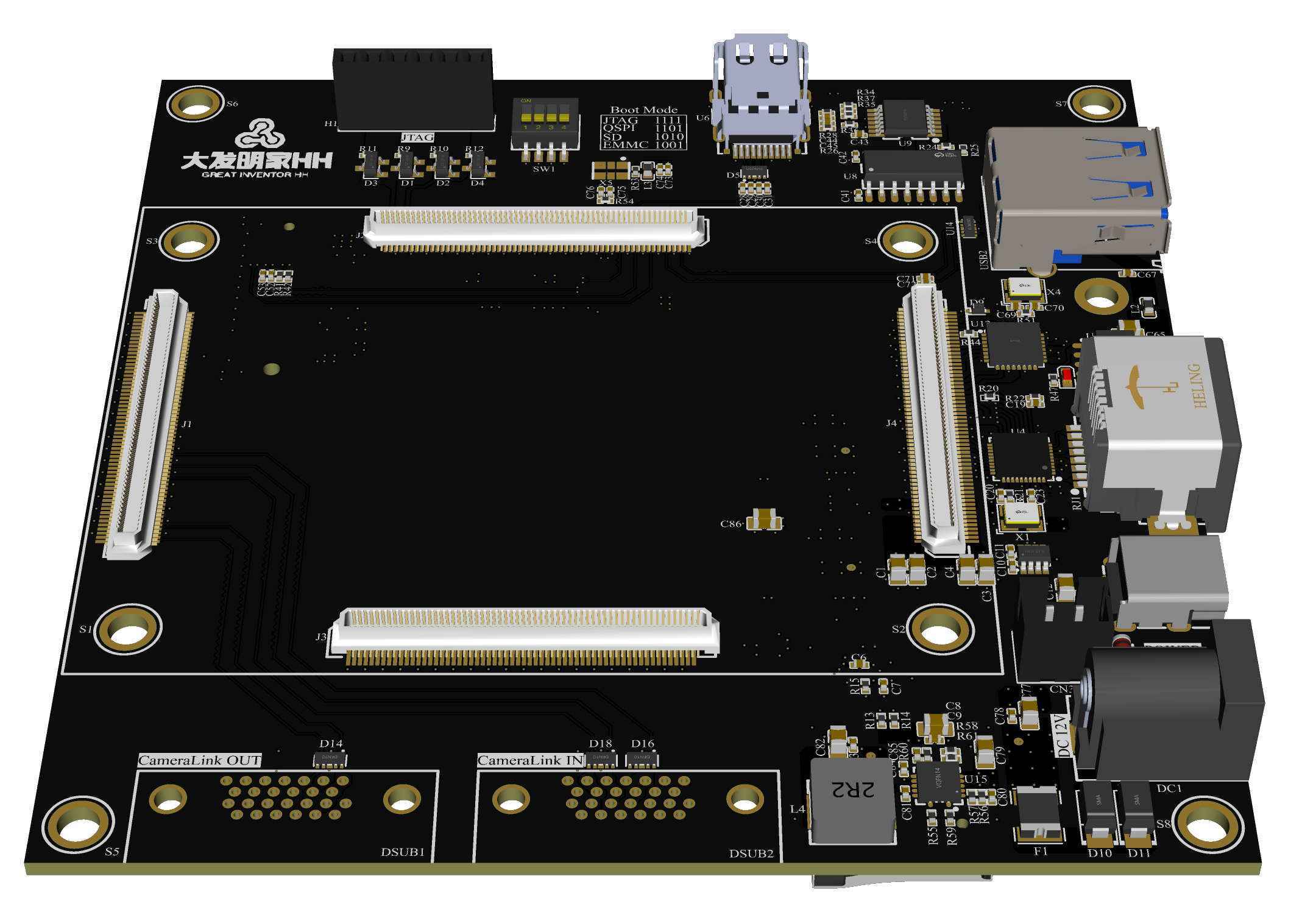 作为Xilinx的老粉,证明自己已经精通Zynq UltraScale+ MPSoC的方式就是设计出一个产品拿在手中把玩,于是就有了如下的设计:HZU4EVCL。采用Alinx家的4EV核心板,PS挂载4GB的DDR,PL挂载1GB的DDR,含有256MBit大小的QSPI FLASH和8GB大小的eMMC芯片。底板实现Cameralink输入、Cameralink输出、M.2接口、DP接口、USB3.0接口、千兆以太网接口、UART串口接口、SD卡接口和JTAG接口,尺寸仅为10cm x10cm。