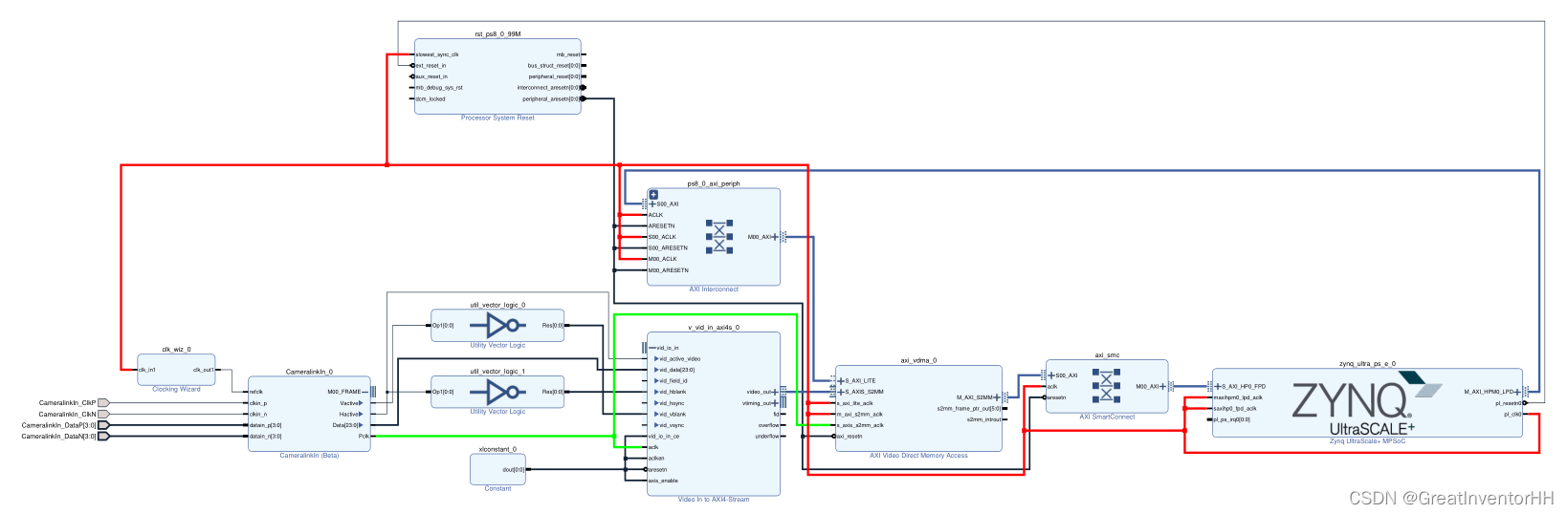 Camera Link接收IP接收的图像数据需要经VDMA送入PS的DDR,VDMA的输入使用的是Xilinx标准的Axi Stream接口,而Camera Link输出的信号是行场有效信号,中间需要加入一个转接模块,这个就是Video In To Axi Stream,Xilinx的图像处理IP核,可以将行场信号转换为Stream信号。所以,完整的采集摄像头数据逻辑为Camera Link In+Video In To Axi Stream+VDMA+PS DDR。在Vivado中的Block Design如下图所示,红色连接线为PS产生的100MHz时钟,绿色连接线为相机产生的65MHz时钟,也是采集数据时钟。Camera Link还需要一个300MHz的参考时钟,由PS产生的100MHz时钟倍频得到。