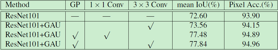 首先,我们评估 ResNet101+GAU 模型,然后我们将 FPA 和 GAU 模块结合并在 VOC 2012 验证集中评估我们的模型。 我们分别在三种不同的解码器设置下评估模型:(1) 仅使用跳跃连接的低级特征而没有全局上下文注意力分支。(2) 使用 1×1 卷积来减少 GAU 模块中的低层次特征的通道数。(3) 用 3×3 卷积代替 1×1 卷积减少通道数。实验结果如表2所示。