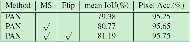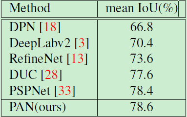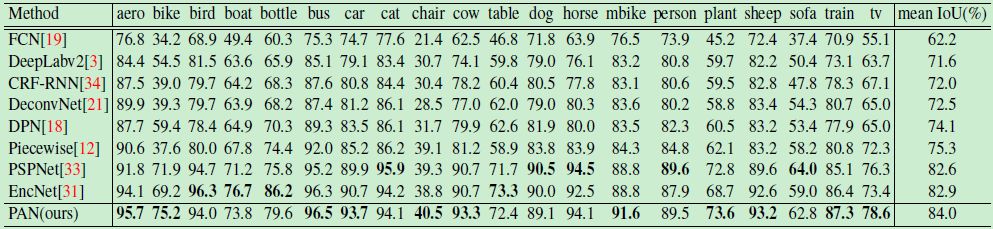 结合 FPA 模块和 GAU 模块的最佳设置,我们在 PASVAL VOC 2012 数据集上评估了我们的金字塔注意力网络 (PAN)。实验结果如表4、表5所示。可以看到,PAN 取得了84.0% mIoU,超过现有的所有方法。