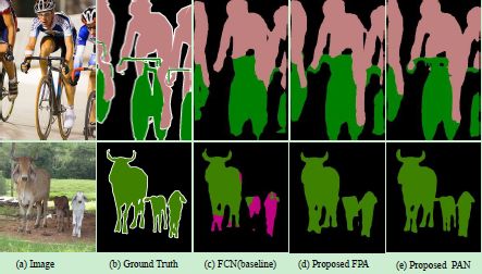 上图中,正如我们所看到的,FCN 模型难以对小目标和细节进行预测。在第一排中自行车的手柄在预测中丢失了,而第二排中出现了错误的动物类别预测。我们的特征金字塔注意力模块 (FPA) 和全局注意力上采样 (GAU) 模块旨在扩大目标感受野并有效地恢复像素的定位细节。