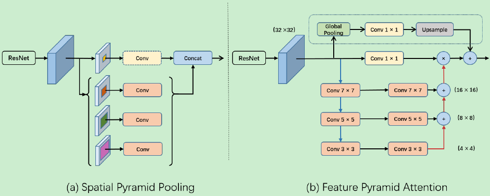 上图中,(a) 空间金字塔池结构。(b) 特征金字塔注意力模块。 '4×4,8×8,16×16,32×32' 分别代表特征映射的不同分辨率。虚线框表示全局池化分支。蓝色和红色的线条分别代表下采样和上采样运算符。