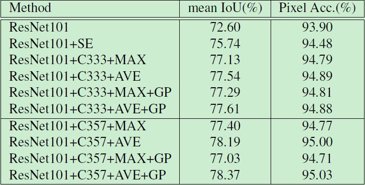 全局池化:我们进一步在金字塔结构中添加全局池化分支以提高模型性能。实验结果表明,在最佳设置下模型能够取得 78.37 的 mIoU 和 95.03% 的 Pixel Acc。