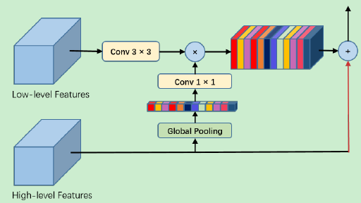 我们提出的全局注意力上采样模块 (Global Attention Upsample,GAU),通过全局池化过程将全局上下文信息作为低层特征的指导,来选择类别的定位细节。具体地说,我们对低层次特征执行 3×3 的卷积操作,以减少 CNN 特征图的通道数。从高层次特征生成的全局上下文信息依次经过 1×1 卷积、批量归一化 (batch normalization) 和非线性变换操作 (nonlinearity),然后再与低层次特征相乘。最后,高层次特征与加权后的低层次特征相加并进行逐步的上采样过程。我们的 GAU 模块不仅能够更有效地适应不同尺度下的特征映射,还能以简单的方式为低层次的特征映射提供指导信息。模块的结构示意图如下图3所示。