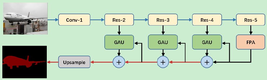 具体来说,他们引入了一个特征金字塔注意力模块 (Feature Pyramid Attention module),在高层的输出上施加空间金字塔注意力结构,并结合全局池化策略来学习更好的特征表征。此外,利用每个解码器层中的全局注意力上采样模块 (Global Attention Upsample module) 得到的全局上下文特征信息,作为低级别特征的指导,以此来筛选不同类别的定位细节。