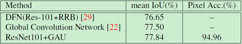 此外,我们还比较了ResNet101+GAU 模型、Global Convolution Network 和 Discriminate Feature Network,实验结果如表3所示。