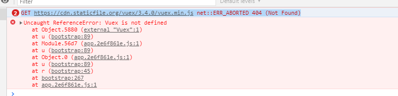 一般情况下出现这种问题;看下cdn上是否具有这个文件(或者之前有,现在删除了),我的就是这个问题本来引入的是https://cdn.staticfile.org/vuex/3.4.0/vuex.min.js版本的vuex,可是打包后经过cdn后,报了下面这个错