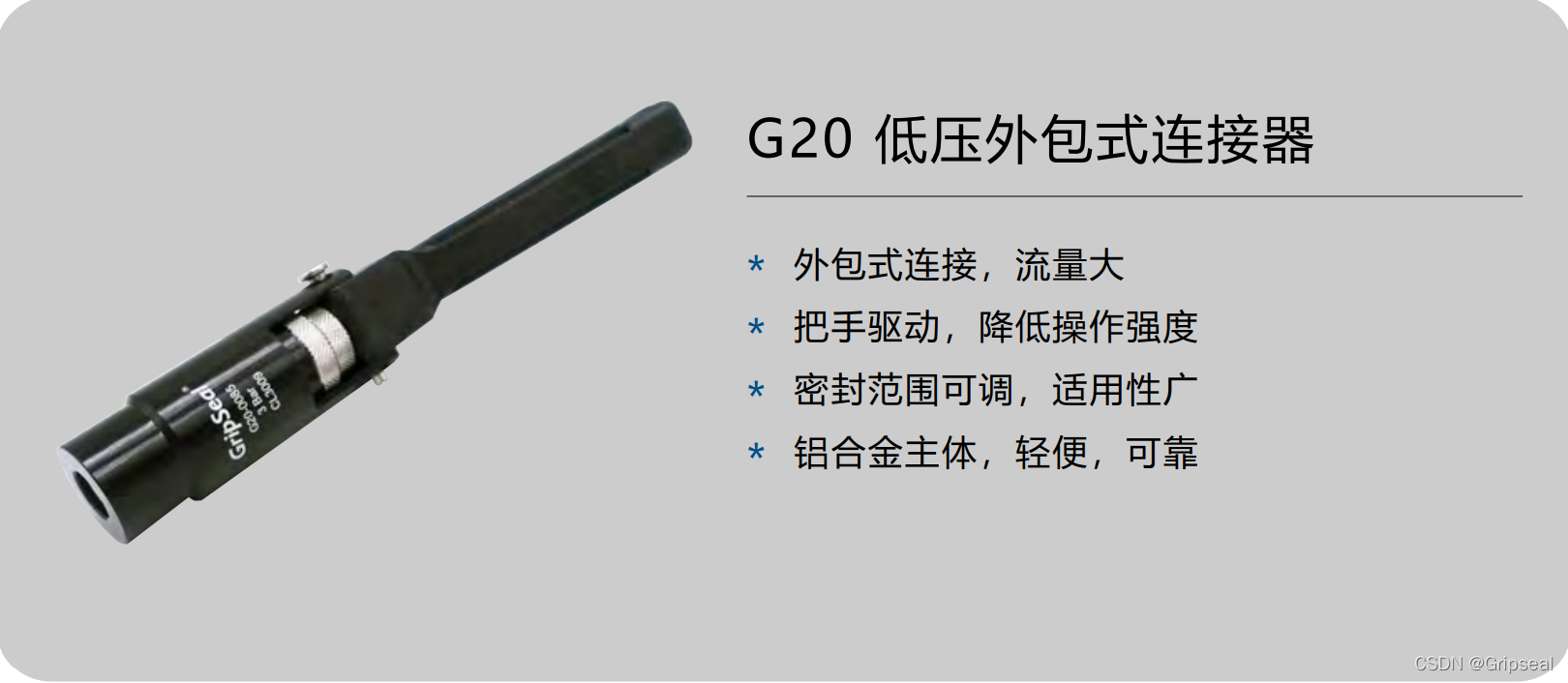 G20系列低压外包式快速接头,适用于测试气3Ba以下的管件密封,采用密封圈膨胀的方式对连接管件形成径向密封面,密封效果好,对测试件外观不会造成任何损伤。尾端把手式操作,操作简单,配置调节螺母,方便调节密封圈压缩量,增大了快速接头的适应范围。