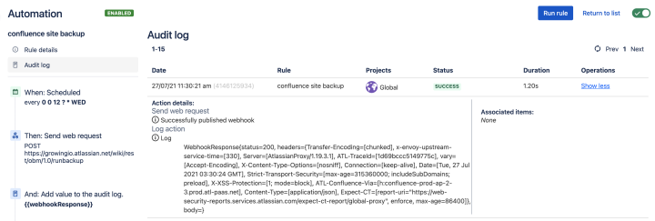在这个规则中我们设置了两个 action,一个通过 send web request 调用 Jira 和 Confluence 的备份接口,另一个接受备份接口返回的 response,记录在审计日志中,用于检查跟踪备份的执行结果。