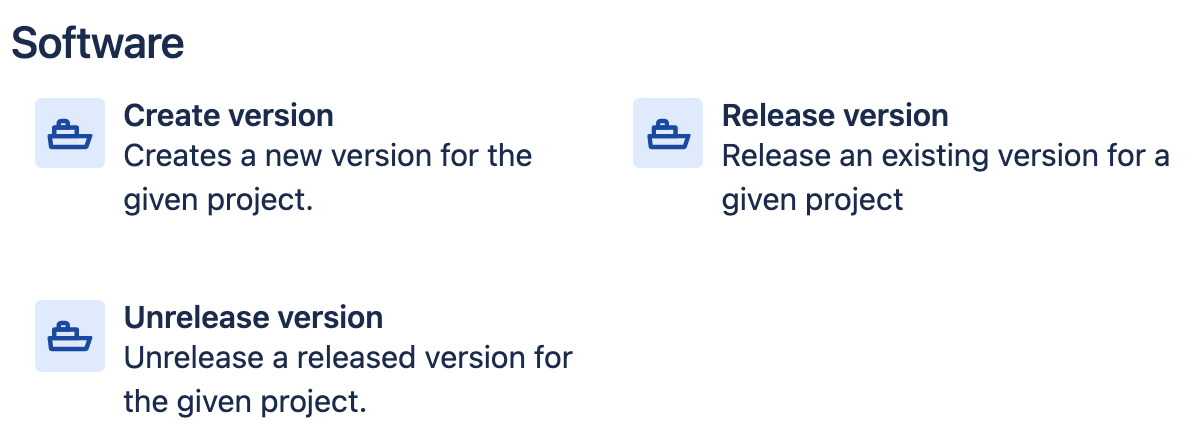 Jira 上关于版本的操作,可以创建、发布、取消发布 Jira 项目中定义的版本,版本名称可以使用正则表达式进行匹配。