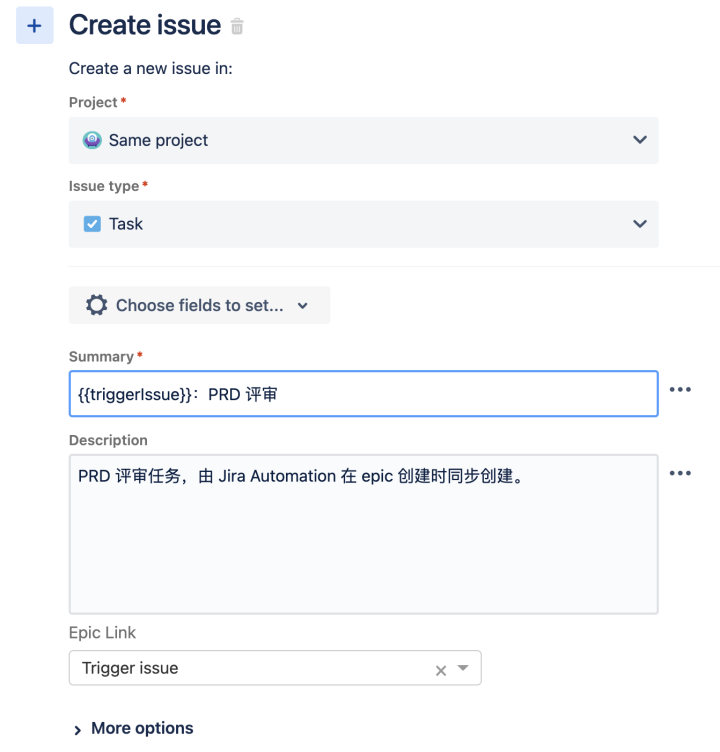 事务摘要中需要使用 {{triggerIssue}} 标记是哪个 Epic 的子任务,不然所有 Epic 下的任务会同名,不太容易区分出来。