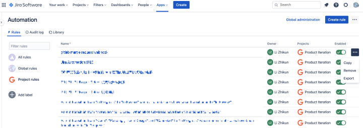 Jira Automation 的管理界面比较简洁,管理界面的规则页面,按照规则类型:全部规则、全局规则、项目规则对所有自动化规则进行了分类,用户可以自定义标签进行规则过滤。列表的每个条目展示了规则名称、拥有者、项目名称,开闭状态开关。单条规则可以进行复制、移出和导出操作。