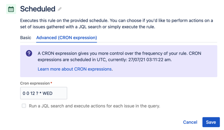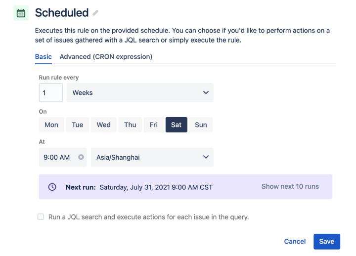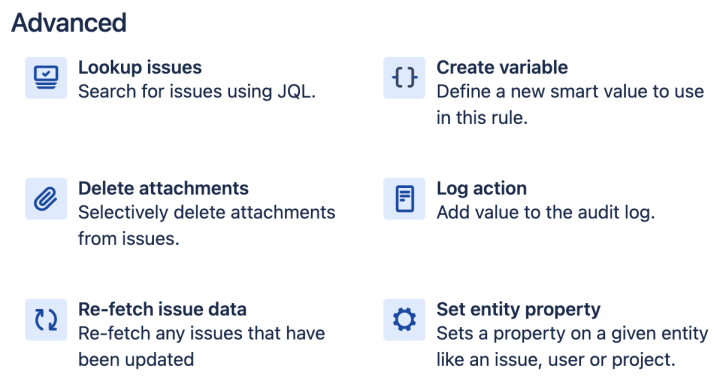 Jira 传统艺能 JQL 的条件过滤,过滤出来的数据会进入后续规则的执行。和传统 JQL 不太一样的是,这里可以使用 smart-values,强强联合。