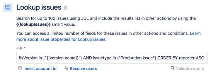 接着我们需要过滤出对应版本中修复的 bug,这里我们使用 Looup issues 组件,在这个组件中我们使用 JQL 过滤出这些 bug,并保存到 {{loopupIssues}} 这个 smart value 中用于后续规则执行时调用。