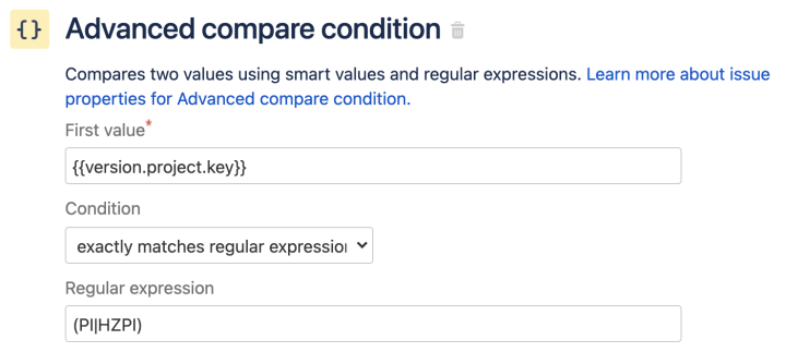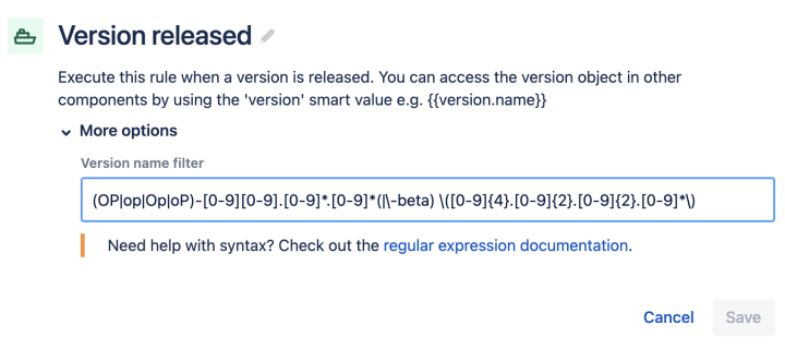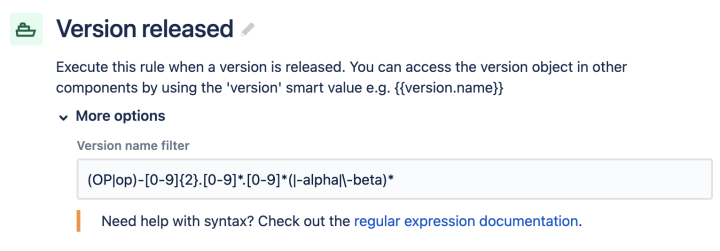 由于我们只希望同步指定开发项目中发布的版本到实施项目中,因此这里我们使用 {{version.project.key}} 进行了正则匹配过滤,只接受 PI 和 HZPI 两个项目发布的版本数据。
