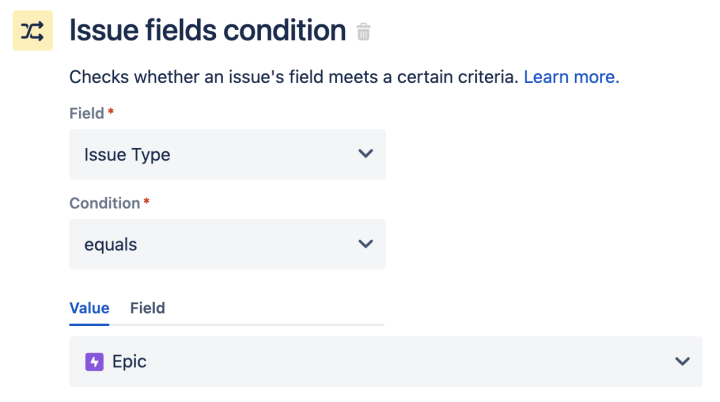 在触发器被触发后我们只需要过滤出我们需要的事务就可以了,条件判断的设置也非常简单,Issue Type 等于 Epic 就可以了。