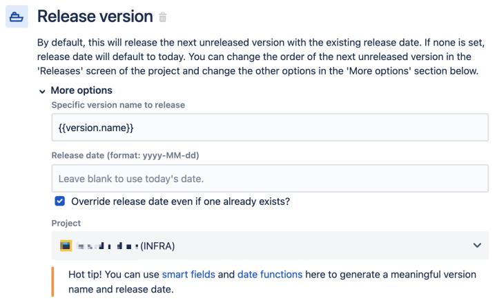 在私有化部署产品开发过程中,迭代发布的版本不一定都会给客户进行部署。同时开发和实施的任务分别在两个 Jira 项目中进行管理,迭代发布版本在开发项目中进行管理,客户侧的版本升级需求在实施项目中进行管理,所以需要将客户侧可升级的版本发布从开发项目同步到实施项目中。Jira Automation 可以好的避免版本同步的延迟和人工同步时可能产生的错误操作。