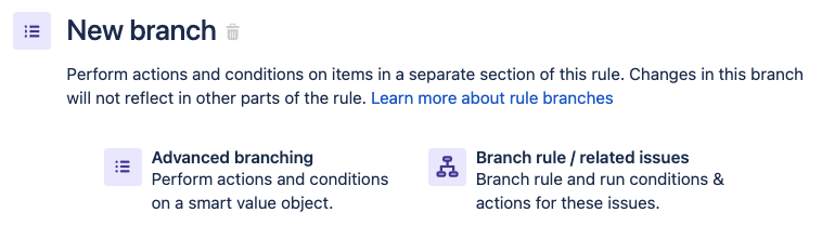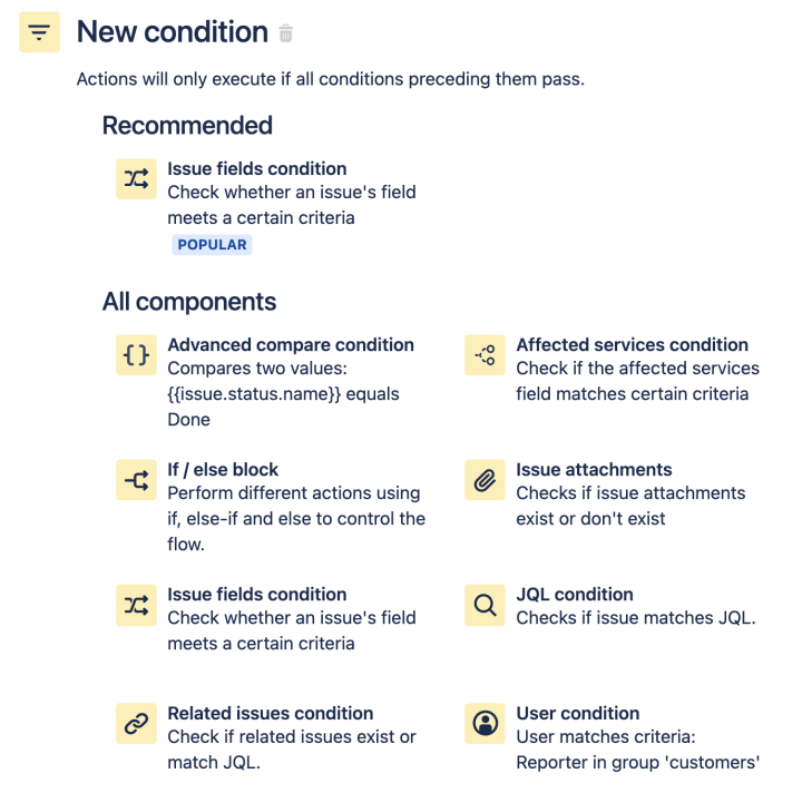 条件判断是当规则定义的触发条件触发后,用于判断后续规则如何执行的组件,Jira Automation 的条件判断相对比较简单,而且只能进行很简单的嵌套,但得益于 JQL 的强大过滤能力以及 Smart Values(下文会介绍)的灵活性,基本能们组绝大部分使用场景,下面挑选经常使用到的几项进行介绍:
