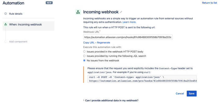 这是一个很有意思的触发器类型,定义这类触发器的时候 Jira 会生成一个 Webhook URL 用于接收其它系统发出的 webhook 请求,并可以接受 issue key 作为请求参数或者请求 body,或是触发一条 JQL 查询,或是不带任何数据的请求,用于触发后续规则。