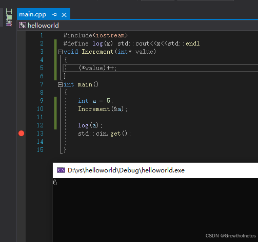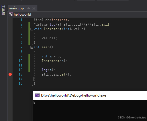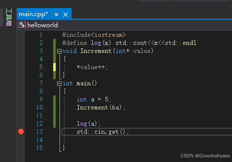 但是这个视频是关于引用的,如果使用引用的话会更简单的实现上面的功能,用更少的代码。我们可以把这里的指针引用改成引用的形式。这样做的好处是我们可以去掉这里的逆引用*,改回原来的value++;调用函数时也不需要传递地址,只需要传递变量a。代码如下所示: