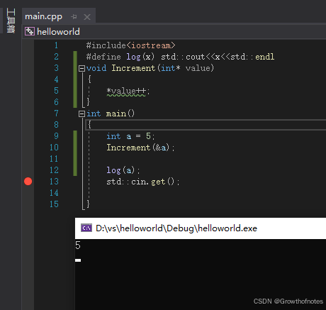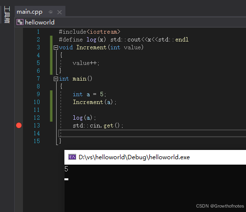 这里将要发生的是,由于我们是传值调用,这里没用指针或者引用。所以调用过程中程序将会拷贝参数值5到这个函数里,直接拷贝,这里将会创建一个新的变量value,就像在Increment函数里面,声明了一个变量value,并赋值给5.然后value++。