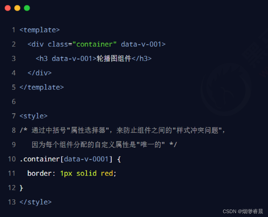 为每个组件分配唯一的自定义属性,在编写组件样式时,通过属性选择器来控制样式的作用域,示例代码如下: