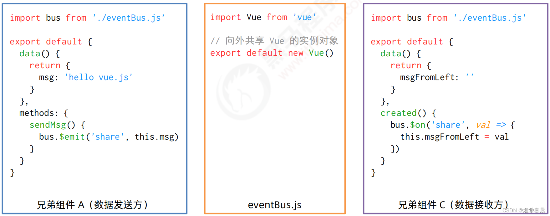 - 创建 eventBus.js 模块,并向外共享一个 Vue 的实例对象;