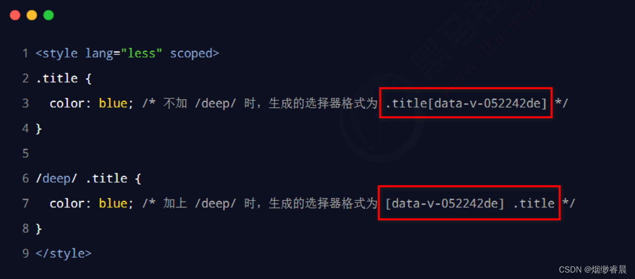 如果给当前组件的 style 节点添加了 scoped 属性,则当前组件的样式对其子组件是不生效的。如果想让某些样式对子组件生效,可以使用 /deep/ 深度选择器。