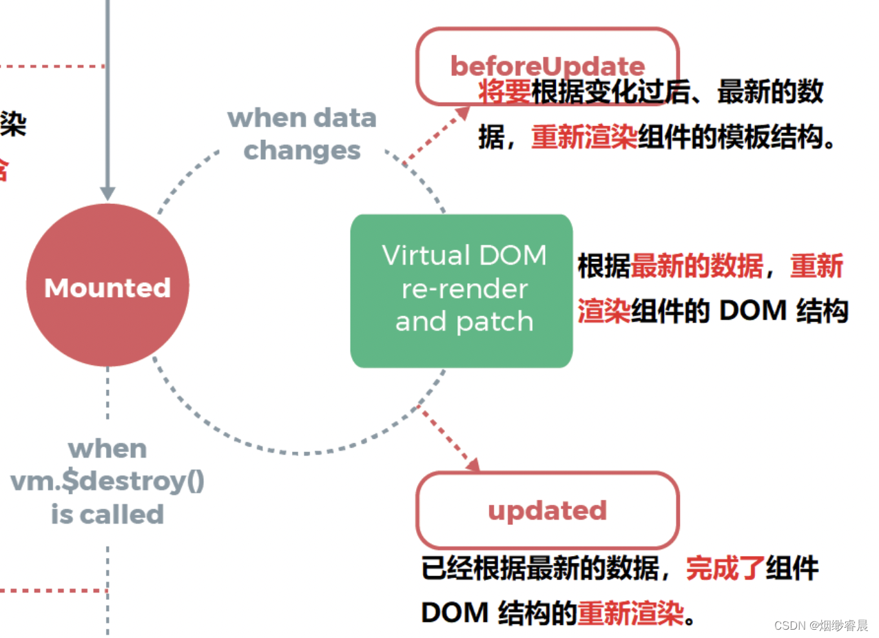 - updated阶段完成了$el中的数据与data中的数据的同步
