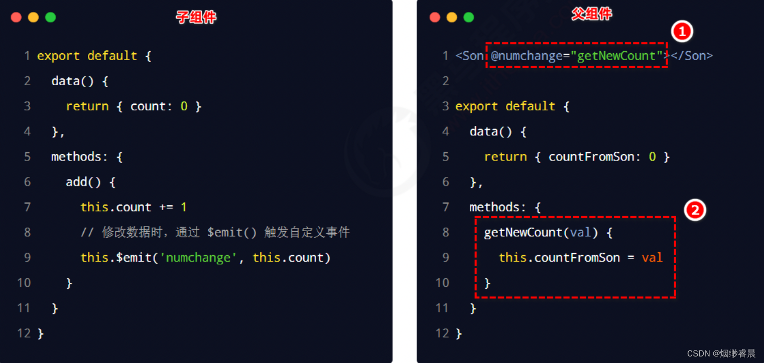 当$emit被触发的时候,自定义事件被触发,对应的处理函数被触发。左边this.count是实参,传递给右边val形参。