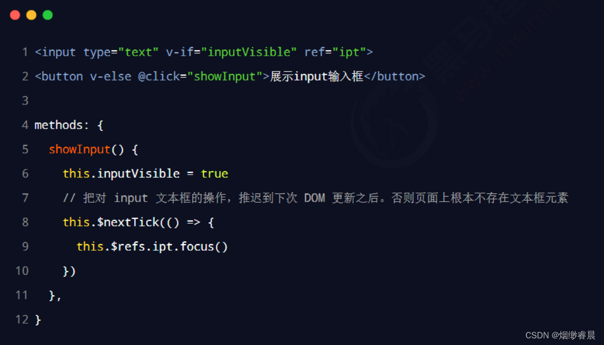 原用:当数据更新时,页面还没有渲染DOM结构。即当 this.inputVisible=true 执行完,页面上还是button而不是文本框,立即执行DOM操作拿不到。所以拿DOM元素的操作应该放在页面更新完之后进行。