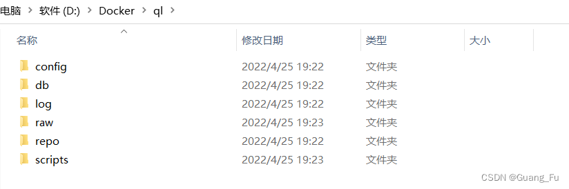 然后去D盘新建Docker文件夹,在Docker文件夹内创建”ql”文件夹,进入“ql”文件夹后创建“config”,“log”,“db”,“repo”,“raw”,“scripts”这几个文件夹。