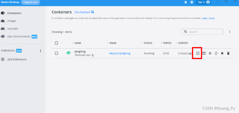 回车执行命令,完成后,随后会自动下载镜像并启动,在Docker程序中可以看到创建的镜像,随后点击下图中的红框图标就可以打开青龙面板了,然后进入http://localhost:5700/青龙面板配置,拉库,选择脚本了 剩下的我就不要多说了