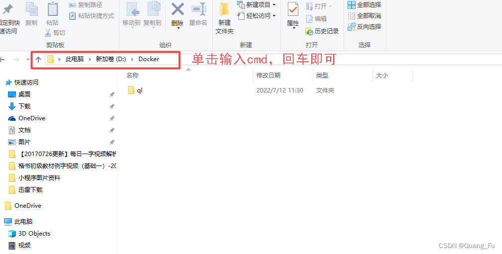 然后返回到Docker文件夹,在地址口输入cmd回车。