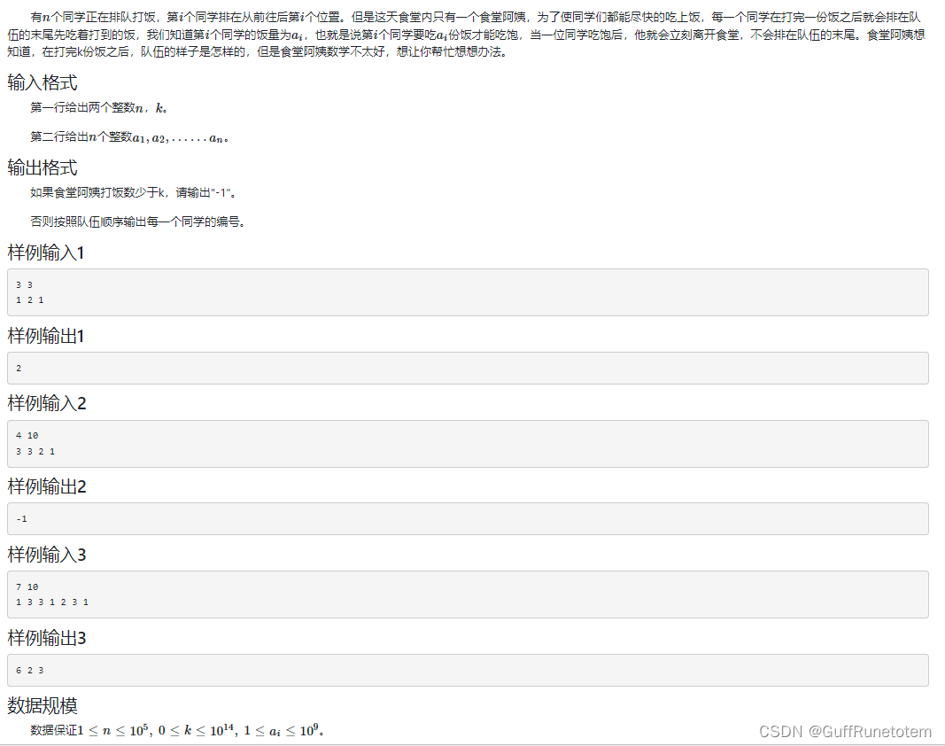 思路:见代码注释,主要在于用二分法寻找打完 k 次饭之前总共会打多少轮(m),注意饭量小的同学在 m 轮后是否还在。最后一轮的打饭时注意先打到的同学会向后排队(或出队)。同时,注意 -1 的判断是总需求饭量与 k 值进行比较。