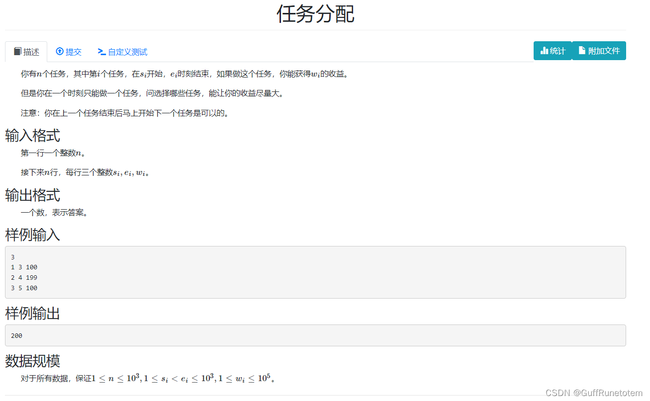 思路:动态规划问题。f[i]作为从0到 i 时间段的最大工作收益。当前时刻 i 的收益至少为 i-1 时刻的收益,因此用max判断。以 j 遍历所有任务的开始时间,如果开始时间 s 与当前时刻相同,那么分为两种情况,一是选择该任务,f[ e[ j ] ] (即结束任务的时刻)的收益等于 f[ i ] + w[ j ] ;二是不选该任务,则等于其本身。由此得出动态转移方程。