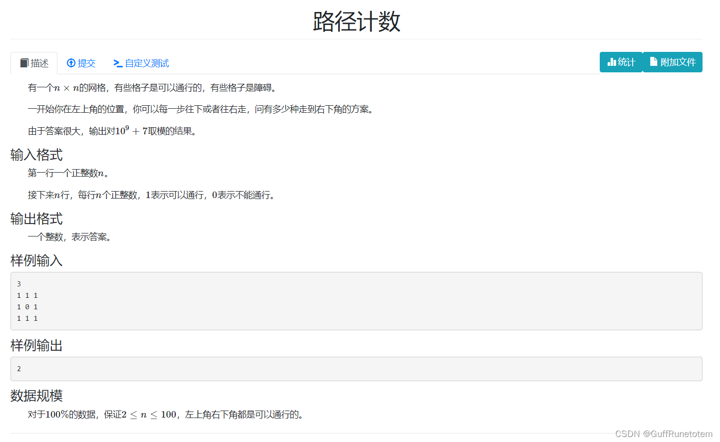 思路:这是一道动态规划题目。f [ i ] [ j ] 代表到达该点的路径总数,由于只有向右和向下两种方向,因此转移方程首先判断该点是否可达(为1),其次加上 f [ i-1] [ j ]和 f [ i ][ j-1 ] 。为保证不越界,每次加完后都需要取模。最后输出 f [ n ] [ n ] 。