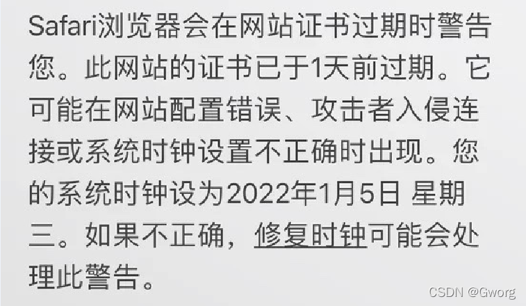 Safari浏览器会在网站证书过期时警告您。此网站的证书已于1天前过期。它可能在网站配置错误、攻击者入侵连接或系统时钟设置不正确时出现。您的系统时钟设为2022年1月5日星期三。如果不正确,修复时钟可能会处理此警告。若要了解更多信息,您可以查看此证书。如果已了解涉及的风险,您可以访问此网站。