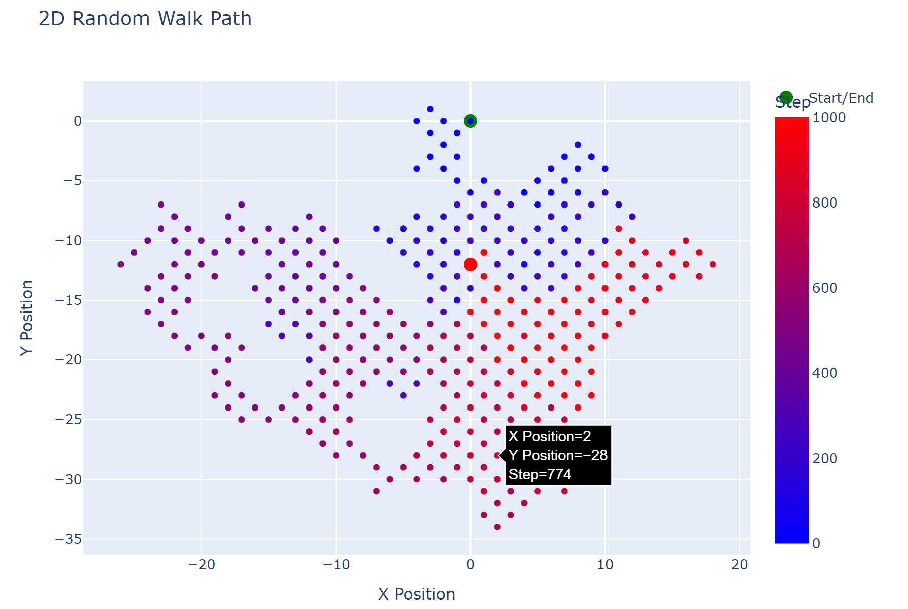 用 px.scatter() 绘制静态随机游走路径,通过颜色渐变显示移动方向: