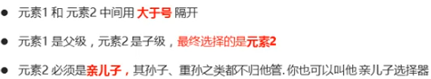 1.子元素选择器(子选择器),只能选择作为某元素的最近一级子元素。简单理解就是选亲儿子元素。