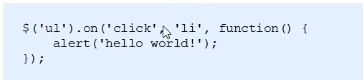 第二个参数是重点,即选中类型的子类元素。我们可以这样来圈中父类,而不需要用隐式迭代来直接给子类嵌套click事件。