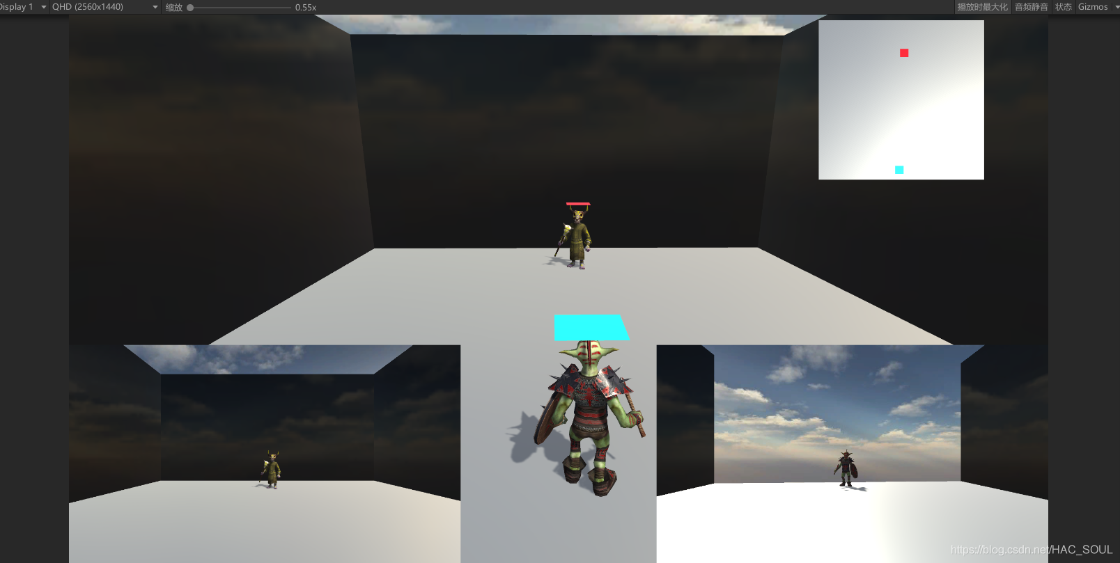 左下角是玩家视角,右下角是敌人视角,底层是第三人称视角,右上角是2D的地图。