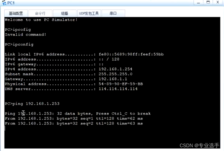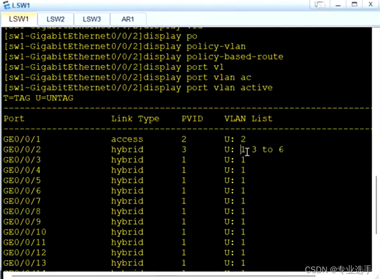 配置了多台交换机(LSW1, LSW2, LSW3)的端口设置,包括接入、混合和中继类型端口,并定义了VLAN范围。R1上配置了子接口及IP地址,启用了DHCP服务并设置了两个IP地址池。实验完成了网络基础设施的配置。