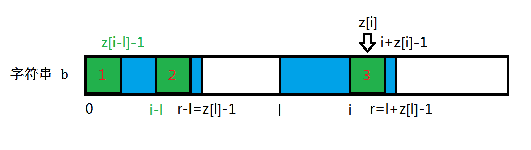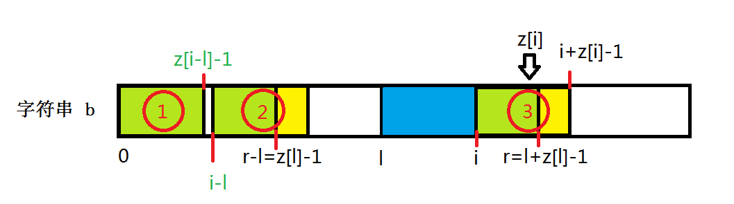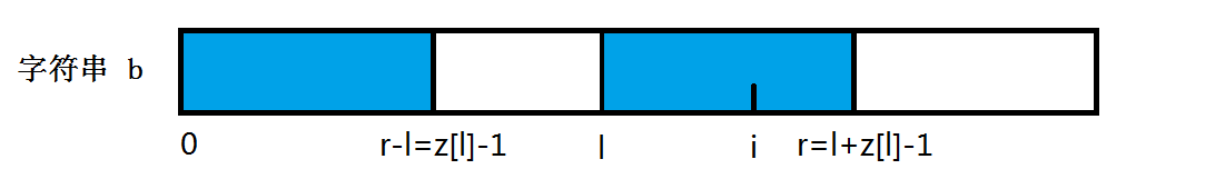 当 i − l + z [ i − l ] − 1 > r − l i-l+z[i-l]-1>r-l i−l+z[i−l]−1>r−l(即 i + z [ i − l ] − 1 > r i+z[i-l]-1>r i+z[i−l]−1>r)时, z [ i ] = l + z [ l ] − i z[i]=l+z[l]-i z[i]=l+z[l]−i(即 z [ i ] = r − i + 1 z[i]=r-i+1 z[i]=r−i+1),超出蓝色部分处需枚举判断,并更新 l = i , r = i + z [ i ] − 1 l=i,r=i+z[i]-1 l=i,r=i+z[i]−1。