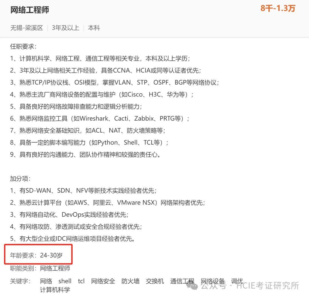 特别是外包、集成、乙方这些网络工程师岗,多数公司更偏爱30岁以内的年轻人,原因很简单: