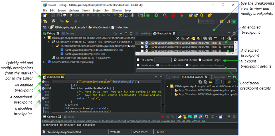 遇到断点时,将暂停执行并打开 Debug 透视图。从 Debug 角度,您可以查看编辑器中的代码、堆栈框架中的挂起线程、控制台输出、与框架关联的变量和断点以及加载的 JavaScript 文件。
