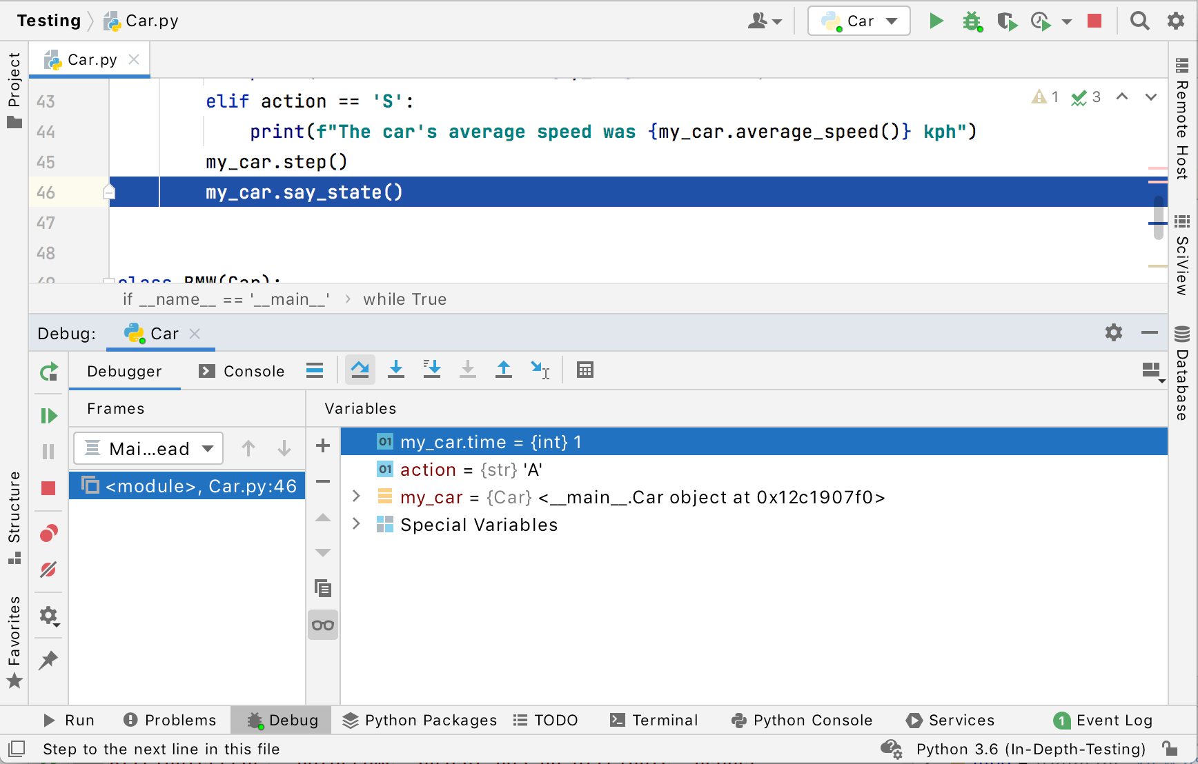 看看单步执行示例程序是什么样子的:单击简历图标按钮,转到控制台询问汽车的平均速度(输入“S”),按下断点。
